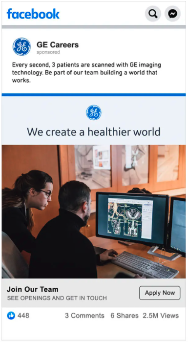 GE also needed evergreen assets they could customize to promote job openings within specific business units: Healthcare, Power, Renewable Energy, and Aviation. We gave them a starter set they can build on to create engaging branded graphics for Instagram, Facebook, LinkedIn, display ads, or email communications.