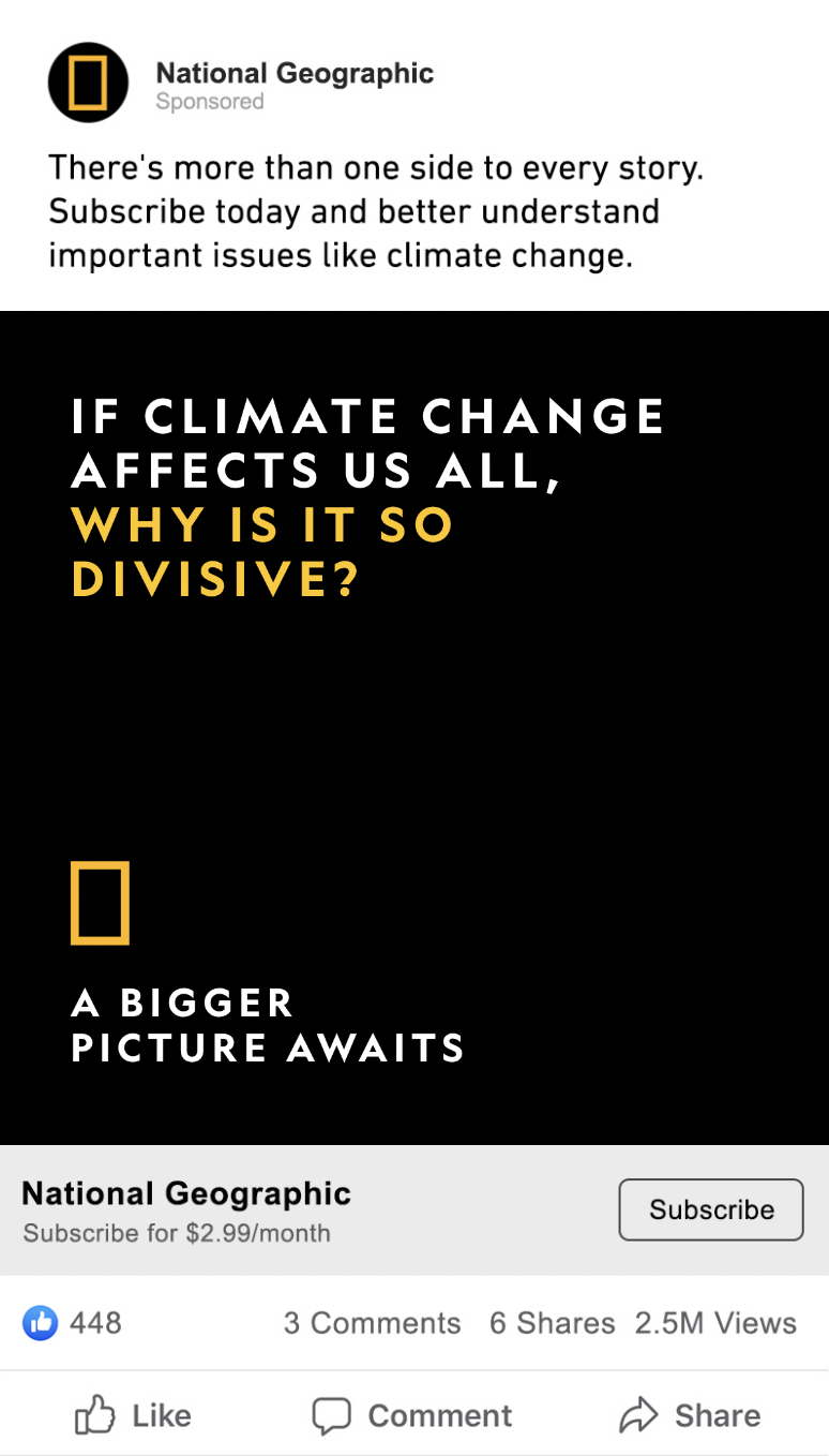 News outlets abound with stories on polarizing topics. But National Geographic pushes these stories further and shows readers there’s a bigger picture beyond the political. We created social content to tease the depth of coverage available to subscribers.