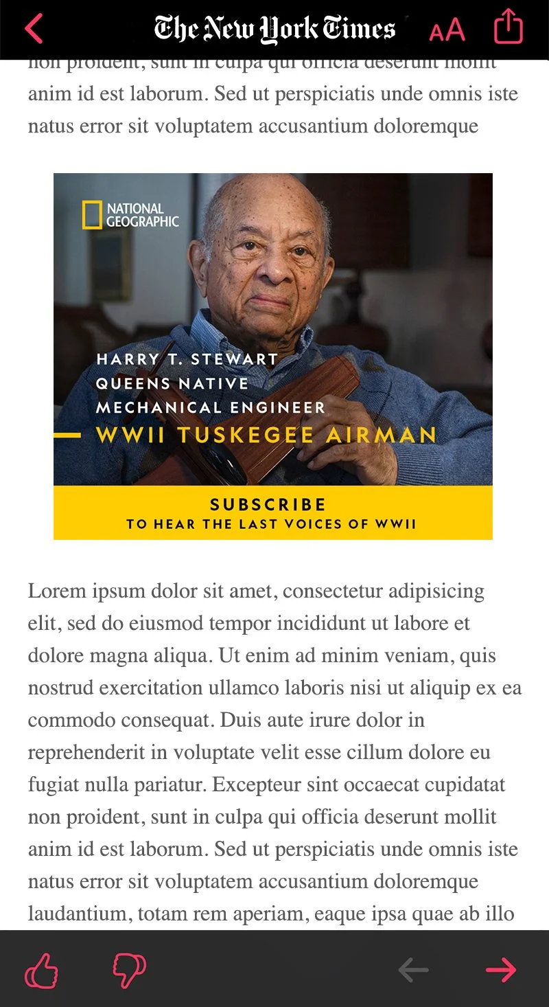 Even though National Geographic is well-known and beloved across generations, younger consumers hesitated to subscribe to what they thought was an expensive printed magazine. Using stories from the 75th Anniversary of World War II issue, we at Nomadic created powerful social and paid media content to capture the attention of the younger audience and show them the value of a digital subscription.